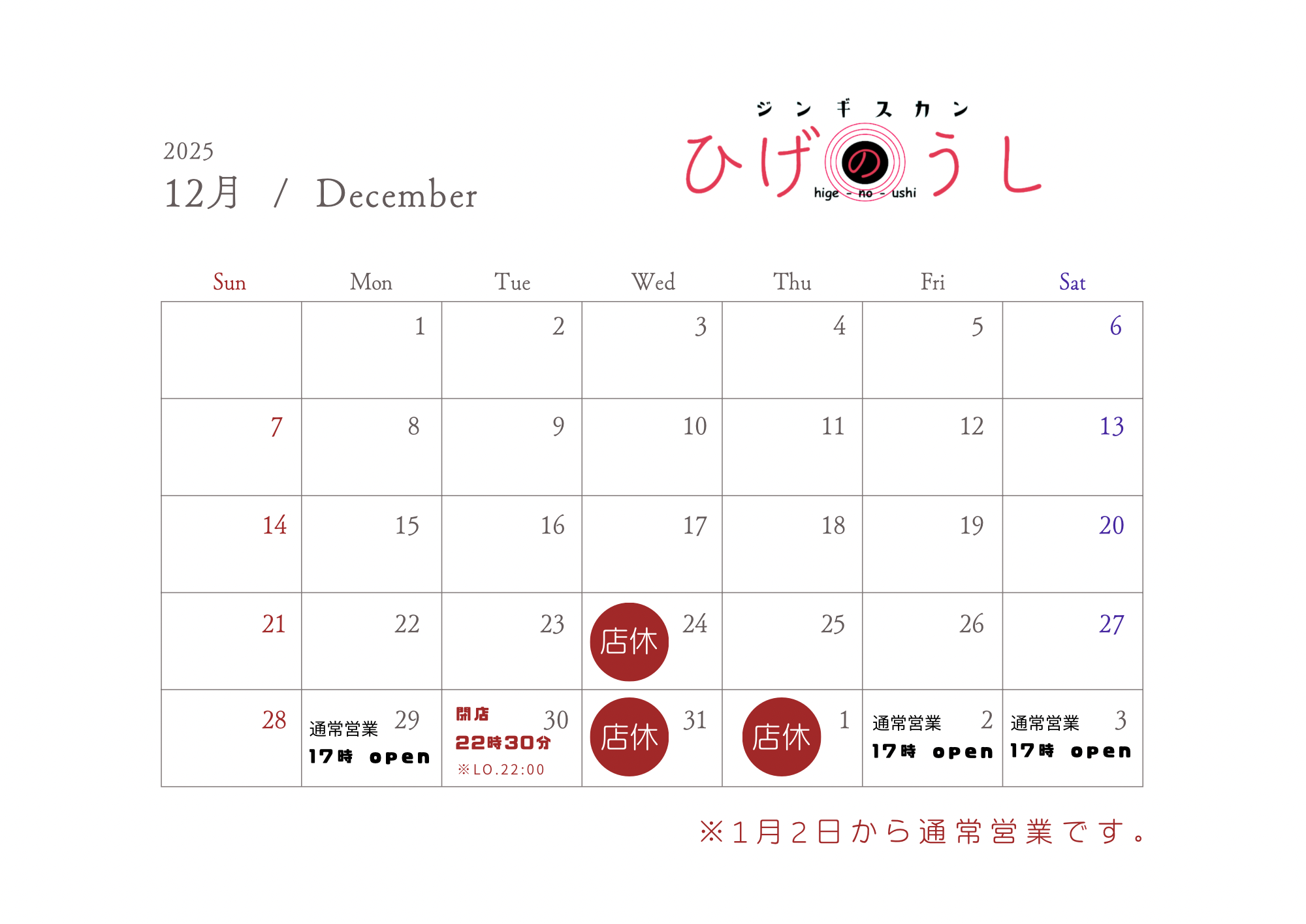 本年もジンギスカンひげのうしをご利用いただき誠にありがとうございました。